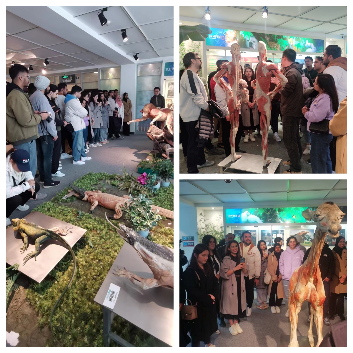 在工作人员的引导下,同学们先后参观了海洋动物展厅、陆地脊椎动物展厅和生命健康展厅。跟随讲解员的介绍,同学们近距离观察了鲸豚、穿山甲、长颈鹿等各种生物的内部构造和器官,这些来源于真实世界的标本通过先进的生物塑化技术让生命以另一种方式得到了延续,令同学们惊叹不已。通过近距离观察人体结构,同学们对人体解剖学有了更直观的理解,为接下来的医学学习奠定了坚实基础。