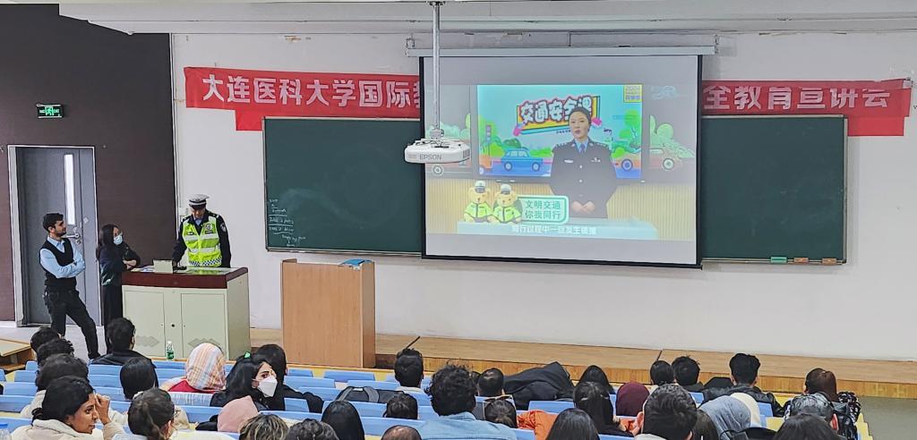 在交通安全教育环节,大连市交警支队旅顺口大队的警官通过播放交通安全教育视频,向留学生详细讲解了中国交通法规和交通安全知识。随后,警官通过播放发生在旅顺口区的真实交通事故视频,向留学生们着重强调了骑电动车佩戴头盔、遵守交通信号、不超速行驶的重要性,并提醒留学生们要时刻保持警惕,自觉遵守交通法规,确保自身和他人的安全。触目惊心的交通事故现场画面令学生深受触动,更加坚定了他们自觉遵守交通规则的决心。