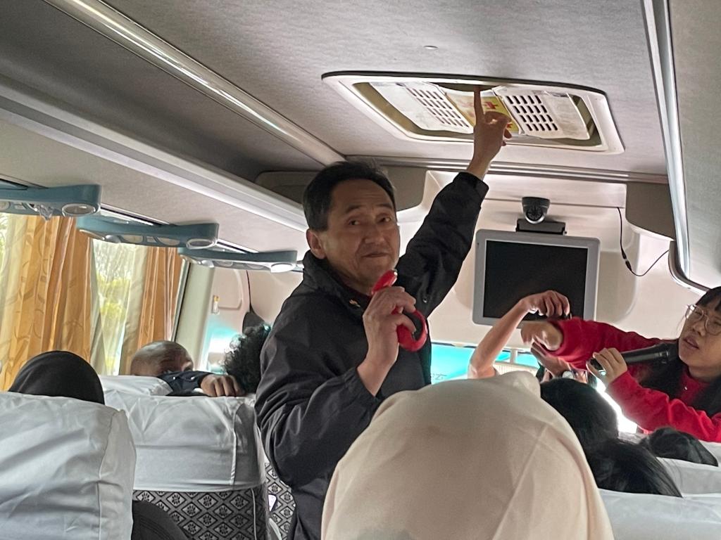 演练开始前,后勤管理处的张文舵主任详细为留学生讲解了干粉灭火器的结构、工作原理和使用方法;之后,师生们来到大巴车上,张老师针对车内安全带、安全锤、应急开关和车顶逃生窗的使用进行了介绍,让留学生们对大巴车应急逃生有了初步的认识。