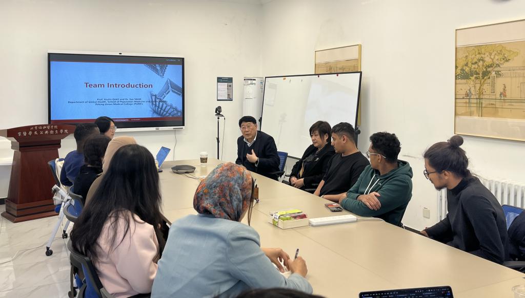 社会实践团第一站抵达北京协和医学院群医学及公共卫生学院。该院特聘教授、我校优秀校友乔友林详细讲解了中国肿瘤防控的发展历程、学院的组织架构、承担的重大科研项目及取得的科研成果,指导留学生们构建肿瘤防控理论认知框架。潘艳介绍了学校“留学大医,感知中国”品牌活动建设情况,并与乔友林教授就持续合作打造这一品牌活动进行了深入交流。