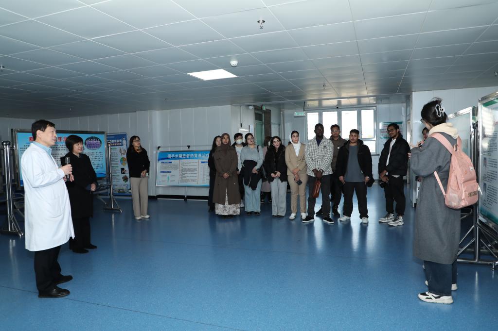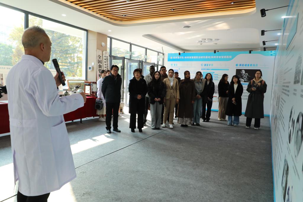 林州市食管癌医院副院长焦广根以昔日林州“水不通、路不通、食管不通”的困境为切入点,深情回顾了北京医疗队的感人事迹。20世纪60年代,医疗队成员在住宿简陋、物资匮乏的条件下,走遍林县山村开展流行病学调查与免费筛查,凭借算盘和简易实验装置完成数据统计,逐步建立起以“早发现、早诊断、早治疗”为核心的“三早”防控模式。他们不仅留下了丰硕的防治成果,更培养了一支“永不走的医疗团队”。“牢记使命,不畏艰难,勇于探索,甘于奉献”的北京医疗队精神深深打动了在场师生。在“北京医疗队精神”文化园,留学生们驻足细读26位专家的事迹介绍,并在纪念碑前合影留念。此外,留学生们还实地参观了胸外科病区,与医生深入交流食管癌手术方式及术后护理等内容,实现了理论与实践的有机结合。